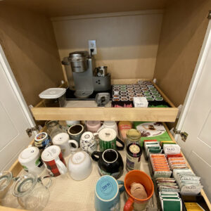 We removed the closet, and then installed tall pantries on both sides of the refrigerator, to transform an awkward, unused wall. Nicole made one of those pantries into a super smart coffee station using the bank of roll out trays for quick and easy access. With the coffee station off to one side, anyone can linger over there without getting in the way of traffic flow. During electrical rough-ins (when the electrician ran the wires) Nicole had them add an outlet into the coffee bar cabinet, so all the cords are contained and out of sight.