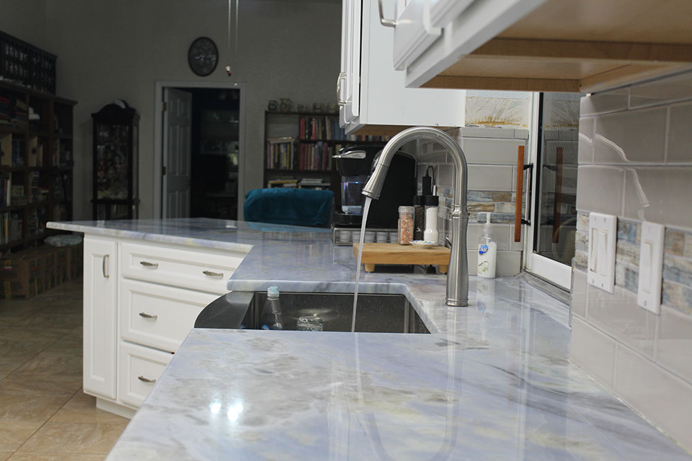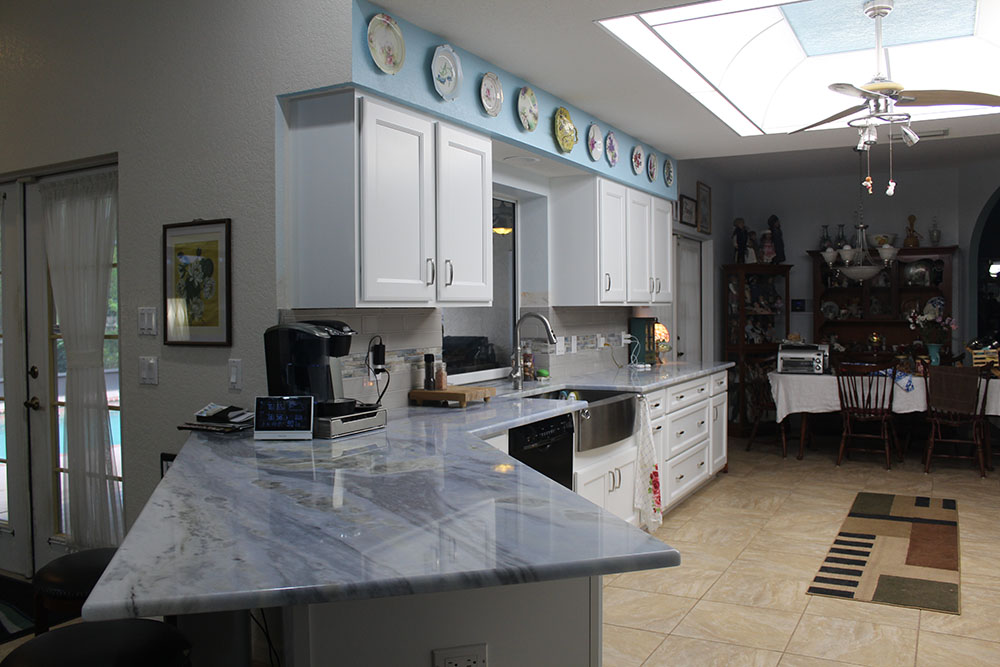 Lapping waves. Light sand. Blue skies. White, fluffy clouds. These are just some of the images that come to mind when you think of the beach. That’s the look and color scheme that Ken and Merle wanted in their new kitchen. The homeowners love the color blue, and it’s a color they knew they wouldn’t grow tired of in a few years.