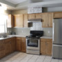 For her kitchen cabinets, Maria wanted to make a big impact without spending a fortune. She opted to go with ready-to-assemble Forevermark cabinetry. Maria purchased her classic oak cabinets from Just Counter’s & Other Stuff. Incidentally, Maria saved dollars on this cabinet line without compromising on quality or function. So, she splurged on adding a “buffet wall” of cabinetry. They were professionally installed by Tyler Mowatt whose knowledge and skill is always valued.