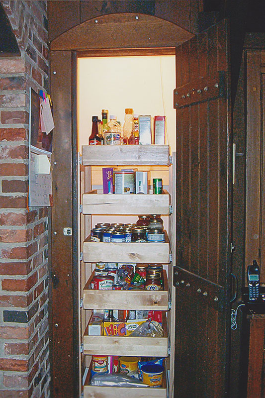 I love this vintage broom closet door with the textured wood and large nail heads. But the inside of it was nothing but wasted space. The solution was to have an accessible and efficient configuration of storage space. So, I designed it with rollout trays. The slide out units was fitted into the narrow space that otherwise had been wasted space for years. The homeowners can now store dry or canned goods in this old broom closet. There are six adjustable wood rollout trays for storage.
