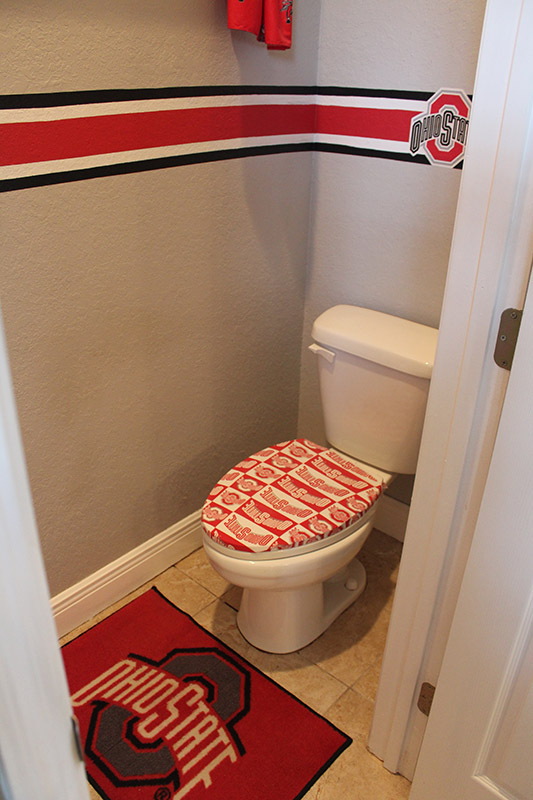 I shook my head. I remained solemn. And, Paul added, “I know you’re not a football fan, but we are both from Ohio.” He had a point. But in all seriousness, there was no reason why I couldn’t give my full-blown-Ohio-State-fan a room of his own. And I didn’t have to break the bank to give my hubby the look he wanted. A water closet is one of those rooms that serve a purpose. Because of that, it sometimes doesn’t get the love it serves. Paul’s now little sanctuary includes art, a wall decal of the Ohio State logo, and a throne.