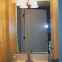 The water line and drain was relocated to the opposite side of the small room to accommodate a 24-inch wide Thermofoil vanity cabinet and a Corian vanity top with an integral sink. The existing recessed open shelves were removed, and new drywall was installed. A knockdown texture was applied to the drywall. Electrical wiring was installed to provide proper adequate overhead lighting. We also added outlets with GFCI (ground fault circuit interrupter) adjacent to the water source and removed the refrigerator from the room. Stainless steel towel bars were installed, along with a beautiful stainless steel Moen faucet. The stainless steel light fixture and hardware created unity and an updated look for this wonderful small bathroom transformation.