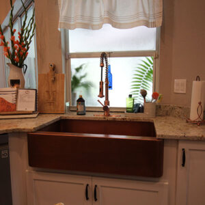 The perimeter of the kitchen was adorned with crisp white cabinets, and warm Kona stain was an excellent choice on the island. Starting with the eye-catching copper farmhouse sink, Olivia found countless ways to uniquely incorporate the copper theme into their kitchen.