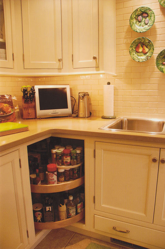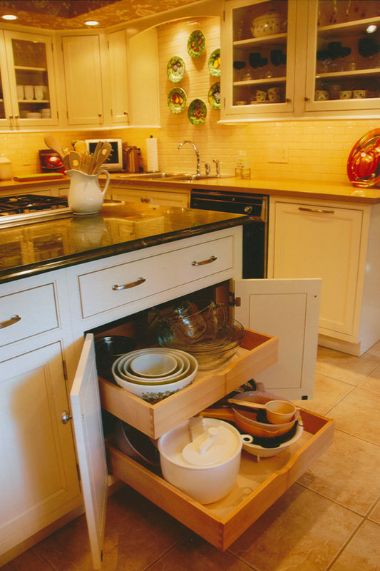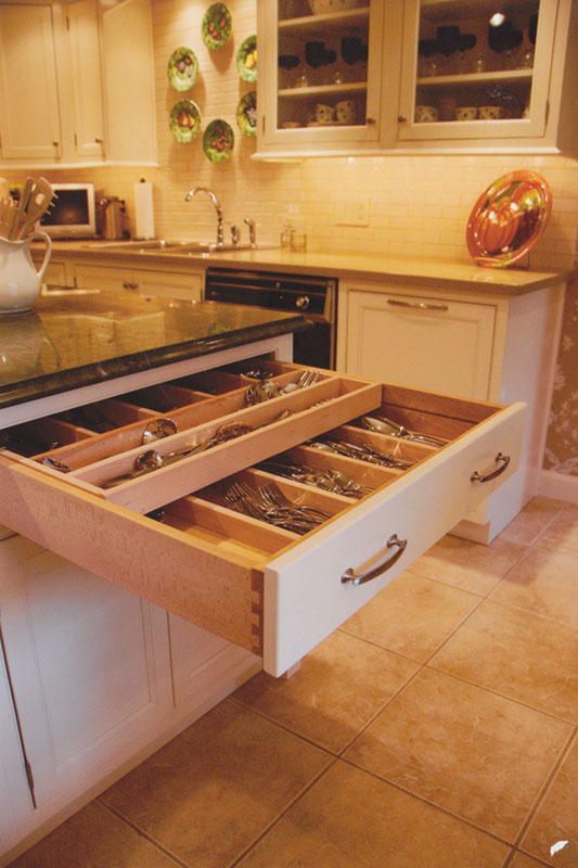 Jody’s kitchen was designed with total functionality in mind. The tall double oven cabinet was designed with a warming drawer below. Jody wanted cabinet accessories such as rollout trays, double sliding cutlery dividers, a concealed waste basket, a working drawer at the bottom of the sink base, and a revolving lazy Susan.