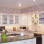 There were butcher block countertops with full-height faux wood laminate backsplash in the existing kitchen. Jody wanted to apply this kitchen design tip: mixed countertop surfaces can be incredibly practical as well as make a dramatic design statement. This gorgeous remodeled kitchen is a perfect example of mixing two countertop colors with two entirely different materials. Corian solid surface countertops were installed on the perimeter of the kitchen with a straight edge treatment. Granite, with an ogee edge, was used on the island. Speaking of the island, the cooktop was flipped to the opposite side of the island from its original position.