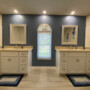 Did you catch that word – freestanding? It’s important to be aware that freestanding bathroom vanities aren’t really “free standing” as the name implies. This type of bath vanity does rest on the floor and can generally stand on its own, but you must still anchor these vanities to the wall for support. In this case, Mike and Debbie didn’t want either one of the vanities to be attached to the corner walls. Many times you’ll see freestanding vanities that are lifted off the floor on legs. However, Mike and Debbie knew this style would be hard to clean the floor underneath. They never wanted to spend any time on their hands and knees cleaning up dust bunnies and hair that their broom couldn’t reach. So, they opted to go with standard cabinets that have a toe kick.