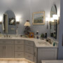 The existing vanity cabinet style was a typical thermofoil design with sinks integrated into the countertop, along with a sitting vanity area. I designed the room that included ample storage space with a more modern, timeless look to meet Susan’s needs, at the same time created the aesthetic style she hoped for.