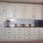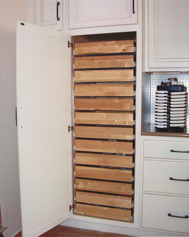 Because Bea’s living room walls were creamy white and the plush, piled carpet was a burnt sugar color, I chose to use maple wood painted in antique soft cream with a caramel glaze. I designed the wall-to-wall cabinetry with many base cabinets, including multiple drawers and overhead wall cabinets with adjustable shelves. Since Bea had accumulated a significant amount of supplies, many of which were extremely tiny and expensive, I knew it was critical to have proper storage space. So, I included two 90-inch high cabinets with roll out trays in my design. Each tall cabinet accommodated 13 rollout trays. This would become home for Bea’s hundreds of stamp and ink pads. The tall cabinet on the far left would be a closet for the broom and sweeper, to assist with thorough cleanups.