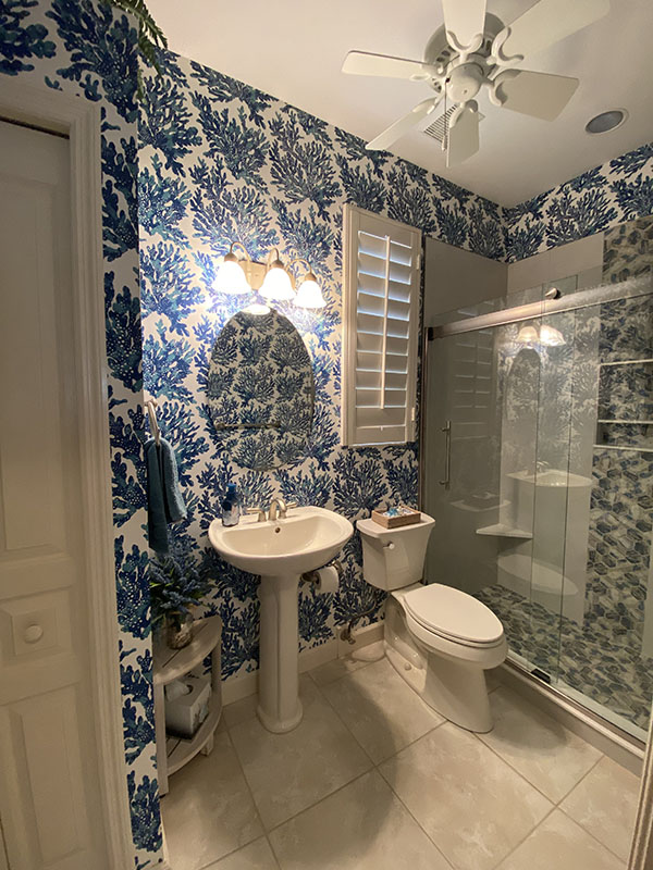 Wallpaper is back with a bang! In the guest bath, Bret and Denise removed the green palm leaf wallpaper and over-the-top-tropical shower curtain. A lot of people worry about resale value when renovating their homes. While it’s wise to take this into consideration when making big decisions, Denise and Bret felt they should decorate this room with what they love. After they stripped the previous wallpaper, they decided to replace it with wallpaper of their liking. Well, they went ahead with the daring vivid blue and white color wallpaper scheme and it’s one of the most-commented-on features of the space now. The stunning new wallpaper adds depth and dimension to the room, creating opportunities for contrast and allowing objects to stand out. They don’t regret it one bit.