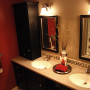 One of the ways we saved money was to use Showplace Cabinetry. We used red oak, which is a low cost wood species. The distressed charcoal stain with red undertones gave the cabinets a custom, polished look. Once the dark stain cabinets were decided on, the rest of the pieces — red accent wall, polished nickel hardware, black and taupe speckled Hi Macs solid surface vanity top — just fell into place. Lee didn’t want the room to look too feminine because it was for her teenage boys. But she wanted it to be appropriate for guests, so she wanted some elegance.