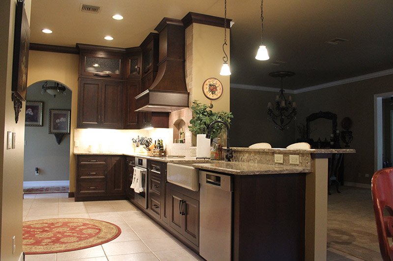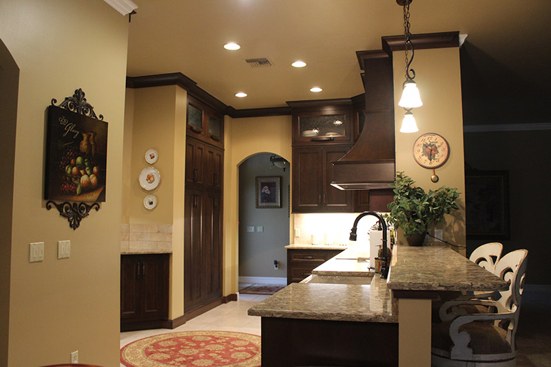 Once inside the home, and immediately off to the right of the foyer, I was welcomed into Mitchell’s and Traci’s newly remodeled kitchen. Instantaneously, my eyes landed on the hearth structure over the cooktop which evoked flavors of a Tuscan-style kitchen. The big decorative wooden hood with the added tile mosaic behind the cooktop topped it off like a maraschino cherry on a sundae.