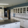 The existing floor tiles were blah and dated. Brown worn cabinets were uninviting in this rather long and wide kitchen.  So, the first thing we did was remove all the cabinets. This gave us a blank canvas. Then big Galapagos Mountain Mist porcelain tiles were installed—on a diagonal—by Pucci Tile & Marble, Inc.