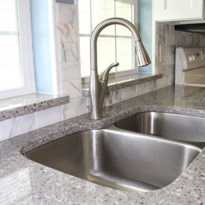 Both Warren and Beverly loved the idea of maintenance free countertops. Cambria is American made and family owned. Their products are made of the finest quartz. They are distinctively durable, nonabsorbent, and easy to maintain. So, we selected Castell by Cambria. Castell Cambria quartz: the color of mist and drizzle, Castell’s gentle grays with specks of blue and white recall the flagstones that anchor the guesthouse in Wales for which it’s named.