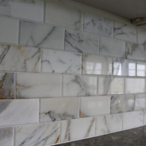 Particularly interesting elegance was added by adding a beveled marble backsplash. There’s veining in the marble which adds a lot of interest to the room. The backsplash is Calcutta polished beveled glass from Bella Casa Collection Tile.